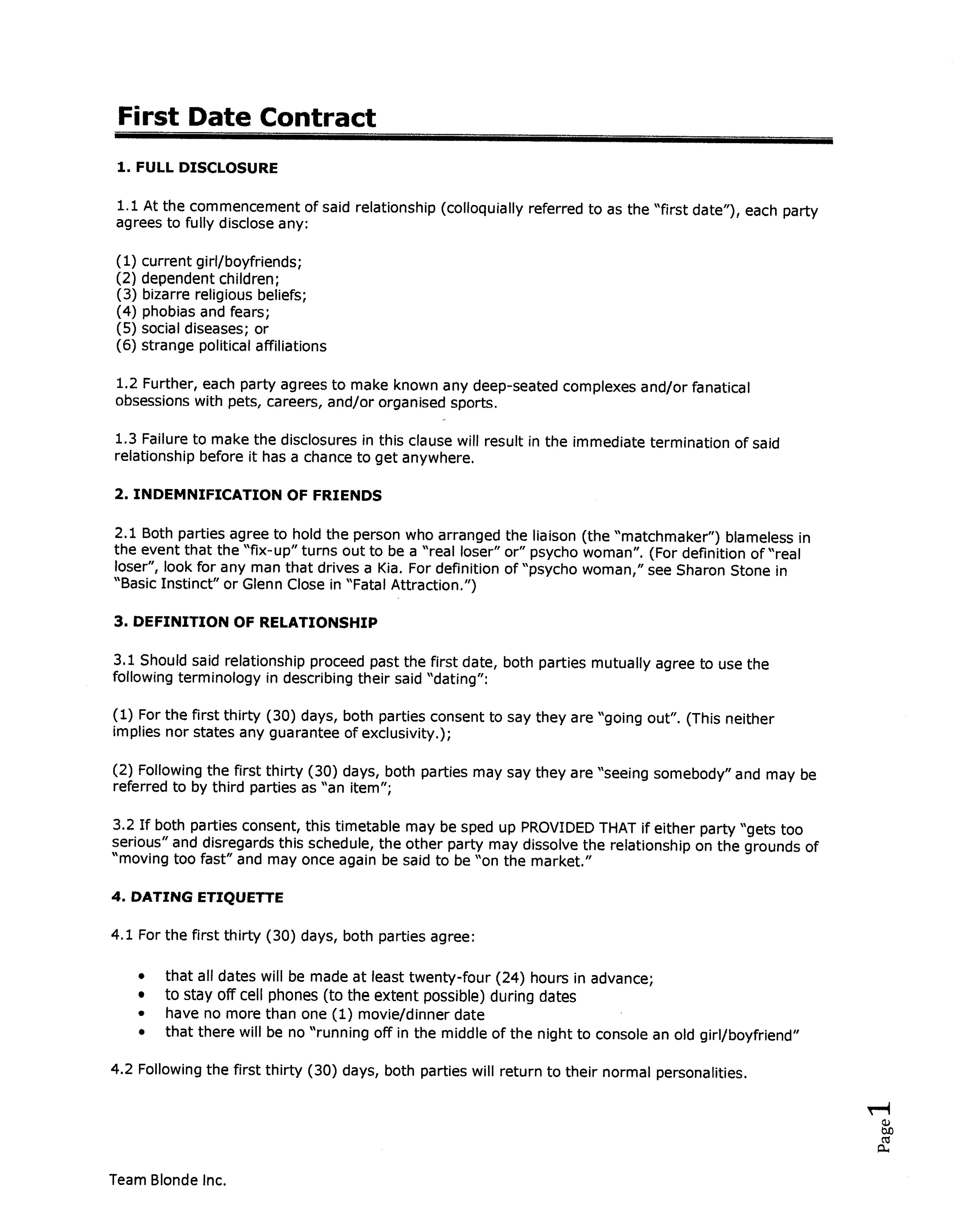 The best thing about the Dating Contract is that my friend had to agree to indemnify the woman who had set them up, which I imagine is good for their friendship.