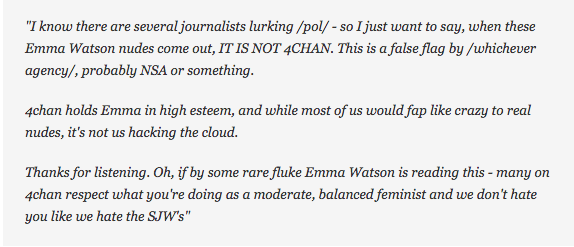 Earlier this week the internet at large was introduced to the site EmmaYourNext.com. The site, thought to be a brain child of the man-trolls that live on 4chan, promised 48 million visitors that a new batch of naked photos were coming and this time they would victimize Emma Watson. Having just spoken at the UN on the subject of gender equality it made sense to most people that 4chan users, well known for their hatred of women and feminists, would attack Emma next.