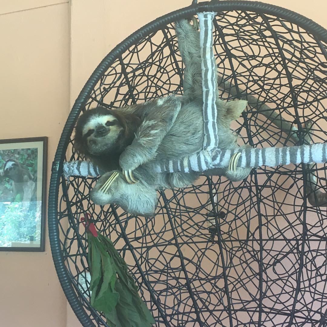 When we arrived I managed to let the polite receptionist tell me at least 2 important details before I rushed off to meet Buttercup; she lives in the dining room in a hanging basket where she gazes upon her many fans. Buttercup is the world’s oldest known living sloth AND the founding member of the Sloth Sancutuary, saved by Judy & Louis Arroyo in 1992 Buttercup is the reason the sanctuary exists.